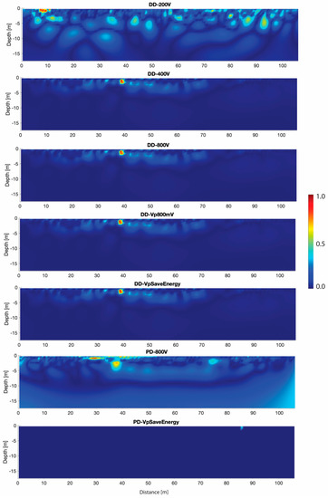 The normalized ERT-error (δERTnorm, see Equations (5) and (6)) of the mean simulated datasets, obtained for each input voltage, is shown in Figure 8. For the DD array, apart for the input voltage equal to 200 V, the highest errors of the inverted models are located within the first 5 m of depth from the ground surface and at a distance of [35 m–40 m] in correspondence of a high resistivity anomaly. The normalized ERT-errors of each simulated dataset for the 200 V input and the PD δERTnorm show the highest variability.