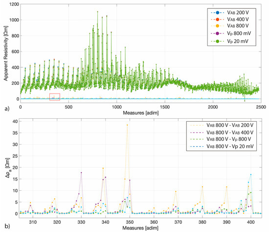 (a) The apparent resistivity values collected for each different input voltage and, around zero, the differences between the most energetic input (that with an AB voltage of 800 V) and the others. (b) A zoom on the differences of the measures between 305 and 405 (those highlighted by the red rectangle in panel (a)).