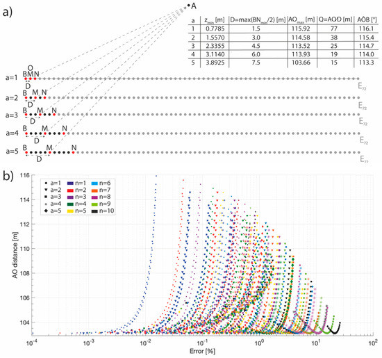 (a) Graphical description of the quantities involved in the computation of the infinite length coefficient (Q) and of the angle between the remote pole (A) and the first electrode of the tomography (B), calculated for each increment of the fixed inter electrode distance a according to the definitions provided by Razafindratsima and Lataste [29]. A and B are the current electrodes, M and N the voltage electrodes, O is the center of the maximum quadripole, and D the maximum quadripole half length. In the table, for each increment of a, are indicated the maximum investigation depth (after [39]), the D (the half of BNmax length) and AO lengths, and the values of Q and AÔB. (b) Distribution of the error, induced by the finite remote pole position, with respect to the AO length for each increment of the inter electrode distance (different symbols) and of the n value (different colours).