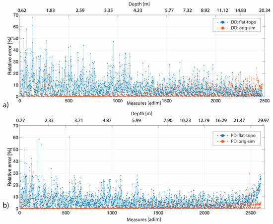 Geometric factor percentage relative error—with respect to both the depth (upper axis) and the number of measures ordered according to the quadripole investigation depth (lower axis)—between the flat and topo dataset (in blue), and between the original and the mean simulated datasets (in orange). (a) Both trends refer to the DD array while in (b) to the PD one.