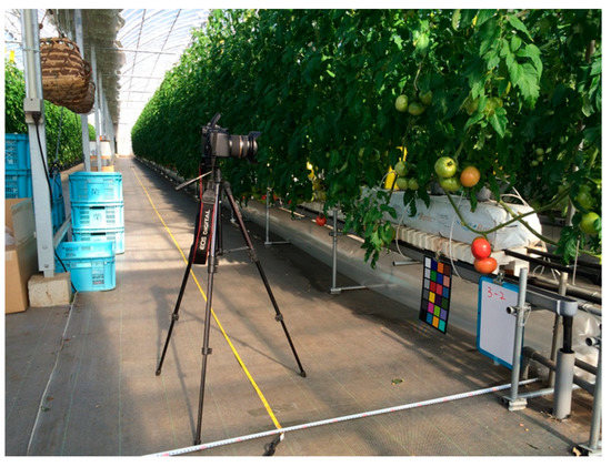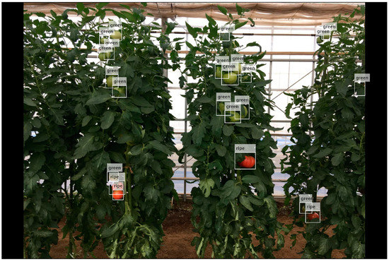 Tomatoes are the second most important horticultural crop [1] in terms of yield, with total production of more than 180 million tonnes across the world (FAO STAT 2017 [2]). The cultivation of tomatoes is one of the most profitable agricultural businesses because tomatoes are self-compatible and have a short life cycle [3]. For high yield and good quality, the crop needs precision management of water throughout the growing period [4], as well as fertilizer and pest control [5]. For example, due to the nonuniform flowering and ripening stages, precise irrigation is needed to ripen immature plants and avoid damage to mature plants [4]. In addition, depending on the ultimate use of the tomatoes, they may be harvested at different stages of ripeness. Tomatoes with “mature green” (medium green to light green) and dim pink colour are shipped, those with reddish-pink colour are sold locally, and those with dark red colour are processed [6]. Thus, optimal tomato cultivation requires tomato-on-plant detection to provide the fruit location and ripening status on spatial variation on which to base agronomic decisions [7]. To inform harvest resourcing and management, and marketing, tomato yield prediction requires dynastically and precise monitoring of tomato number, size, and ripening status [8,9,10]. The combination of computer vision and the Internet of Things (IoT) makes it possible to accurately monitor the growth of greenhouse crops [11]. In addition, as the agricultural population decreases and ages, robots are being considered as replacements for humans to undertake manual and tedious tasks such as harvesting. Harvesting robots perform harvesting actions after collecting and analysing the information from their surroundings [12]. Hence, robot-assisted tomato harvesting also requires the detection of the target fruit.