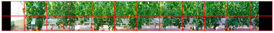 One row of the photos was used as test dataset (Table 3) to test the performance of the model in tomato localization. The images were pre-processed using the following five steps: (1) stitch the adjacent photos into six large images using Image Composite Editor (Microsoft Corporation, Redmond, Washington, USA); (2) pad the image on the left and right sides; (3) resize the image to 0.5 of its original size; (4) crop the image by a fixed size of 1296 × 864 pixels, as shown in Figure 2; and (5) rename the subimages as digital sequences for processing in TensorFlow.