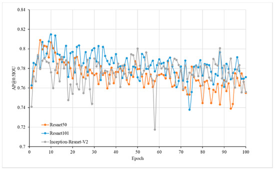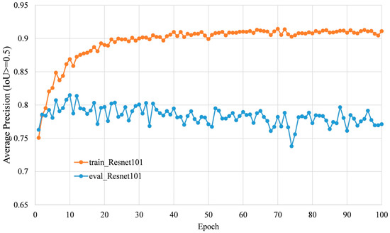 Overfitting is a common problem in machine learning. According to observations of the AP with the epoch (Figure 10), the faster R-CNN model with Resnet 101 showed overfitting after epoch over 10. One reason may be the size of training dataset was quite small which consisted of 1779 subimages (864 × 1296 pixels), as the model was pretrained on the COCO dataset, which consisted of 118,287 images and 80 classes for training (https://www.tensorflow.org/datasets/catalog/coco). Enlarging the training data size and diversity may help to solve this problem. Data augmentation techniques [31] could artificially enlarge both the number and the variety of training images and have been shown to yield significant performance gains [23]. In this research, only random horizontal flip was used as the data augmentation method, and more data argumentation methods will be used to get a better training model in the future.