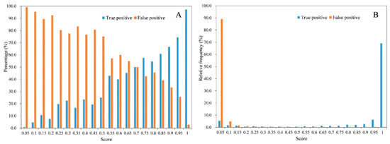 Distribution of true positives and false positives with scores by applying the tomato detection model on the test dataset. (A) Percentage change of true positives and false positives with scores; (B) relative frequency change of true positives and false positives.