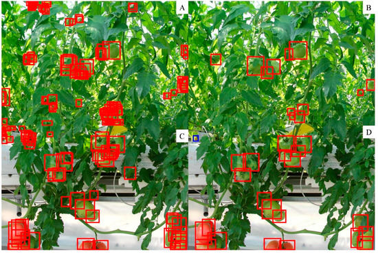 Example of all detected tomatoes (A,C) and filtered detected tomatoes with a score ≥ 0.5 in the test dataset (B,D).
