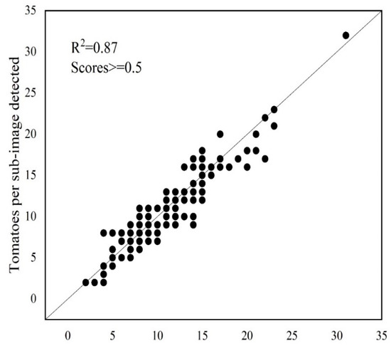 Tomato counting is the basic step for yield estimation [9,21]. Through the application of the selected deep learning model to the test dataset, tomatoes were detected, and the boxes of tomatoes in each subimage were labelled (Figure 6A,C). According to the distribution of true positives (Figure 4), the detected tomatoes were filtered by score. Then, only the tomatoes with scores ≥ 0.5 were retained (Figure 6B,D), and the number of tomatoes in each subimage was recorded. Correlation analysis of the number of labelled and detected tomatoes per subimage showed a high coefficient of determination (R2 = 0.87). However, the number was slightly underestimated when the tomato number was greater than 20 per subimage, as shown in Figure 7. This may be caused by some tomatoes with low scores (less than 0.5), which were filtered out. One example is the tomato in the image shown in the blue box of Figure 6D, of which less than a quarter was visible and was quite small, but it has been manually labelled.