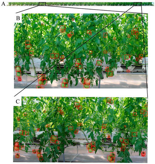 Detected bounding boxes of the tomatoes in the stitched image. (A) is the location map for tomatoes in one row; (B,C) are two enlarged zones in (A) for clear illustration.