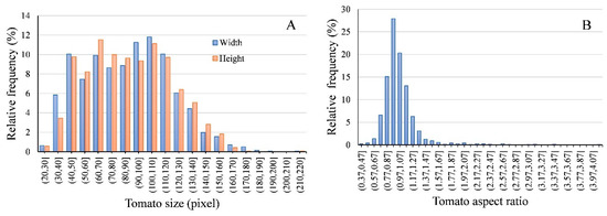 Relative frequency change of the tomatoes size (A) and aspect ratio (B) in images. Tomato size is represented by box width and box height. Tomato aspect ratio is calculated by width/height.