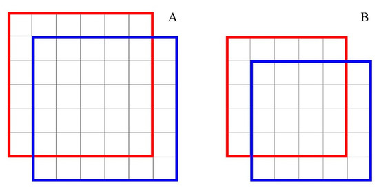 Illustration of the IoU value difference for the same offset in pixels but for different size objects. The IoU of the left boxes (A) is 0.53, and the IoU of right the boxes (B) is 0.47. Although both of them has the same offset (one pixel) in the same direction, the left detection is true positive while the right one is false positive with IoU threshold of 0.5.