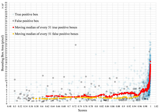 Area distribution of detected true positive boxes and false positive boxes with the scores, and their moving median value with the scores.
