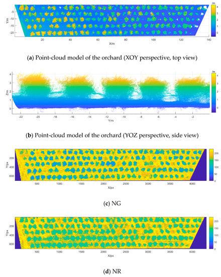 As shown in Equations (4) and (5), the row segmentation position obtained by the grayscale projection method was converted into a 3D point-cloud model, which could adopt the same row and column segmentation position, thereby realizing the unified row and column segmentation positions with the multimodal data of the orchard. Conversely, the row and column segmentation position obtained by kernel density estimation from the 3D point-cloud model was also converted into vegetation index images: