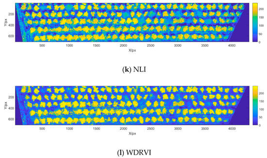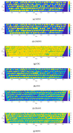 Figure 1a shows an image of the 3D point-cloud model from the top view (XOY perspective) of the measured area of the apple orchard. Figure 1b shows the 3D point-cloud model from the side view (YOZ perspective) of the measured area in the apple orchard. Figure 1c–l, respectively, show the NG, normalized red (NR), NDVI, green NDVI (GNDVI), CIG, DVI, optimized soil-adjusted VI (OSAVI), RDVI, nonlinear VI (NLI), and wide-dynamic-range VI (WDRVI) images of the measured area in the apple orchard (grayscale of vegetation index images, convert the index value to 0–255). The formulas to calculate the vegetation indices are shown in Table 3.