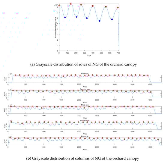 The grayscale image of the NG index was used for row and column detection in the orchard. Figure 2a shows the Y-axis grayscale projection of the orchard vegetation index image, which is the cumulative grayscale value for all the rows in the grayscale image of the index NG. The peak and valley values of the Y-axis cumulative grayscale values are marked with red and blue circles, respectively, and the local peak values of the Y-axis cumulative grayscale values were taken as the row segmentation positions. The row segmentation positions were saved into the array L; the images of each row’s area were also saved. Likewise, the X-axis in the image for each row’s area was in turn grayscale projected, and the local peak values in the cumulative grayscale values and their corresponding X-values were searched. As shown in Figure 2b, the local peak values of the X-axis cumulative grayscale values for each row are marked with red circles, and the local grayscale peak values of the X-axis were taken as the column segmentation positions, which were saved into the cell array C{i}.