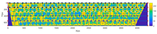 In Figure 4, when using the RCGP detection method and GSD values of 2.13, 3.31, 4.39, 5.43, and 6.69 cm/px, the average correction/accuracy rates of column detection in the grayscale image of NG index were 100.00%, 98.71%, 98.77%, 99.38%, and 100.00%, respectively, and the average erroneous-recognition rates were 1.94%, 4.42%, 3.78%, 3.76%, and 3.23%. With the RCGP detection method, the accuracy rate and misrecognition rate in column detection were not significantly affected by GSD.
