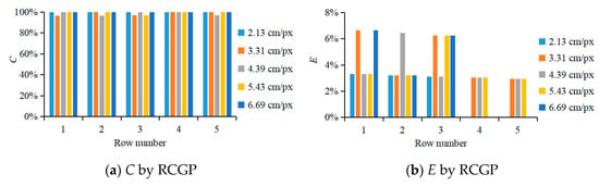 In this study, the correction/accuracy rate C and the erroneous-recognition rate E were calculated with Equations (17) and (18). Statistical analysis of the RCGP method was performed, and the performance of column detection when GSD was 2.13, 3.31, 4.39, 5.43, and 6.69 cm/px was compared.
