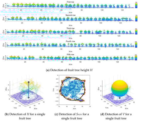 Figure 5a shows the detection results for the fruit tree canopy height H, where the highest point and lowest point in each fruit tree area were detected, and the distance between the two points was the height of the fruit tree, as shown in Figure 5b. Figure 5c shows the detection results for SXOY, the projected area of the fruit tree canopy, which is the area enclosed by the projected boundary of the point-cloud model in the XOY perspective, the red circle and the column mark the boundary convex hull point set. Taking the coordinates with average values of the X-axis and Y-axis of the point-cloud model as the center point, the equivalent circle of canopy projection was drawn (the black circle in Figure 5c). The area of this circle is equal to SXOY. In this study, the average value of the trunk of the fruit trees was 0.6 m, and the shape of the canopy was similar to that of an ellipsoid. Hence, based on the tree height H, the height of the trunk, and the projected canopy area SXOY, the volume of the canopy-circumscribing ellipsoid of fruit tree was calculated, as shown in Figure 5d.