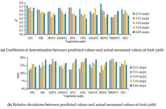 When GSD was 2.13, 3.31, 4.39, 5.43, and 6.69 cm/px, for Input 1, in which the characteristic values of vegetation indices NG, NR, NDVI, GNDVI, DVI, CIG, OSAVI, RDVI, WDRVI, and NLI were separately used in the BPANN prediction model, R2 ranged from 0.59–0.73, 0.54–0.63, 0.44–0.59, 0.51–0.67, 0.48–0.68, 0.40–0.65, 0.49–0.66, 0.43–0.77, 0.44–0.59, and 0.48–0.63, respectively (Figure 6a); RAD ranged from 12.18–15.86%, 13.59–18.69%, 15.49–19.33%, 13.12–16.59%, 12.32–18.95%, 12.82–19.48%, 13.60–18.74%, 10.47–17.15%, 16.76–19.45%, and 14.26–18.31% (Figure 6b); RMSE ranged from 9.94–12.23 kg, 11.65–13.10 kg, 12.17–14.68 kg, 10.91–13.90 kg, 10.79–14.21 kg, 11.37–14.74 kg, 12.90–15.45 kg, 9.18–14.10 kg, 12.76–16.85 kg, and 11.53–14.88 kg. The statistical data showed that when the color moment characteristic values, textural characteristic values, and 3D morphological characteristic values of one vegetation index were input into the yield prediction model, the correlation between the predicted yield value and the measured value was not significant, and the differences in the prediction performance between various vegetation indices were not significant. The main reason was that one vegetation index has limited information, and the correlation between fruit yield and fruit tree morphology is not significant enough, which led to the inadequate performance of the fruit yield prediction model.