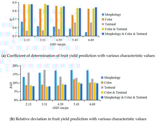 When GSD was 2.13, 3.31, 4.39, 5.43, and 6.69 cm/px, for Input 5, the R2 of the BPANN prediction model was, respectively, 0.88, 0.88, 0.84, 0.83, and 0.83 (Figure 7a); RAD was 8.57%, 7.85%, 9.23%, 10.23%, and 10.10% (Figure 7b); and RMSE was 8.35 kg, 6.74 kg, 8.18 kg, 8.62 kg, and 8.28 kg. The statistical analysis showed that when the color characteristic values and textural characteristic values of fruit tree vegetation indices were input to predict the fruit yield, the model correlation was significant; as GSD increased, the performance of this prediction model worsened. The model performance was similar to that of Input 3. Hence, the color characteristic values and textural characteristic values of canopy vegetation indices can be used to predict fruit yield, but considering the prediction performance, textural characteristic values can be ignored, and the color characteristic values of canopy vegetation indices can be used by themselves to predict fruit yield.