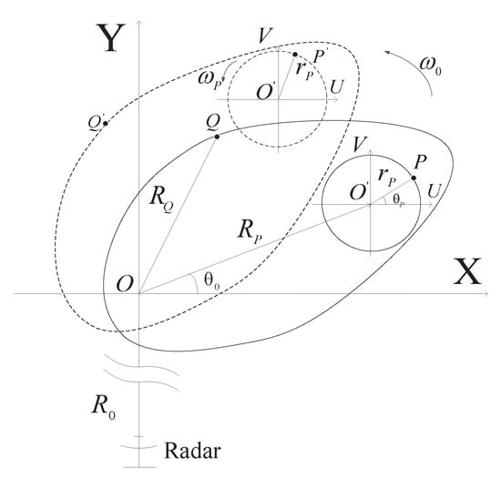 where B, and c denote the bandwidth, carrier frequency, and light speed, respectively, and denote the slow and fast time, respectively, and represent the reflection coefficient and instantaneous range between the scatterer and the radar at the slow time . . From Figure 1, we find that the distance between main body scatterer Q and reference point O satisfies