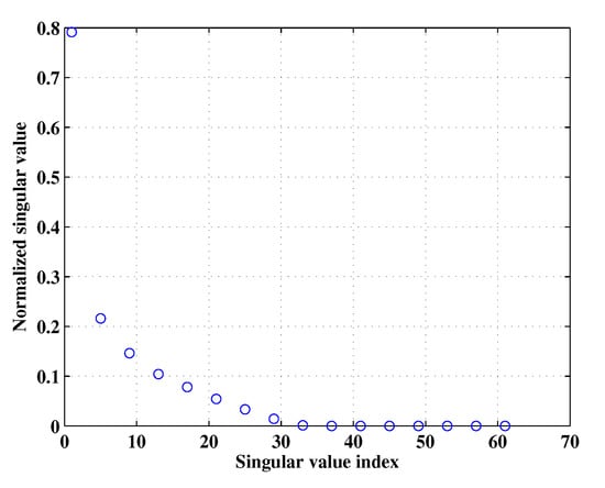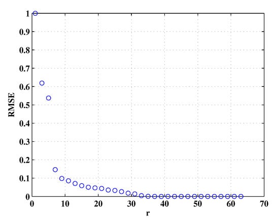 In this subsection, we investigate the property of Micro-Doppler effect in RD domain and reveal the fact that has a low-rank feature. It is known that the truncated singular value decomposition (TSVD) technique offers the rank-r approximation of a given matrix by using the r-dominated singular values. Herein, we analyze the low-rank property of by using TSVD and the details are given below. By applying SVD to a given matrix , we have , where denotes conjugate transposition operator, and are orthogonal matrices, is is a diagonal matrix with singular values of . comprising non-negative singular values of in decreasing order. Then, the approximated matrix of , denoted as , where , and is a diagonal matrix with its diagonal elements are the r largest singular values of . To quantitatively evaluate the difference between and , Root Mean Square Error (RMSE), which is defined as , is introduced, denotes Frobenius norm. In this simulation, the number of rotating scatterers, the fast and slow time samples were set as 2, 128 and 128, respectively, the received data were generated according to (9), the normalized singular values of it are shown in Figure 2. We can see that the distribution of the singular values decays fast. The RMSE of and is shown in Figure 3, we can see that, can be well approximated by a matrix , meanwhile, when the top 40 largest singular values are employed to compute , the reconstruction error is very small indicating that is capable of capturing the most energy of . As mentioned above, we argue that both Figure 2 and Figure 3 shed light on the low-rank of . It is pointed out that the prior knowledge about the Micro-Doppler signal is the basis of our approaches proposed in this paper.