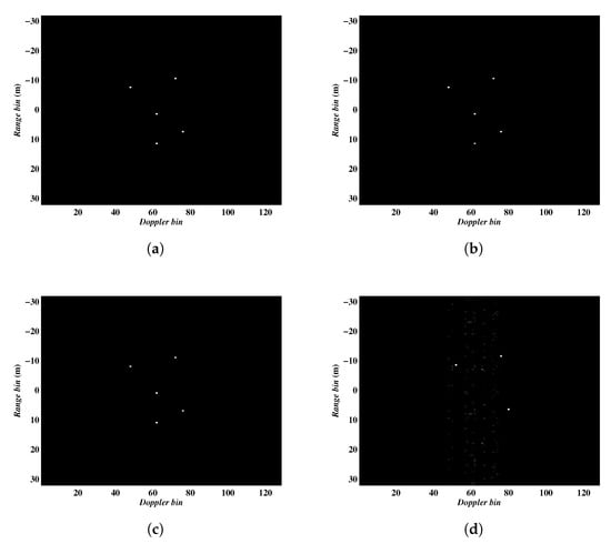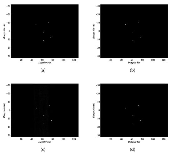 ISAR imaging results obtained by different methods. (a–d) corresponding to the imaging results by Algorithm 1, Algorithm 2, methods proposed in [,], respectively.
