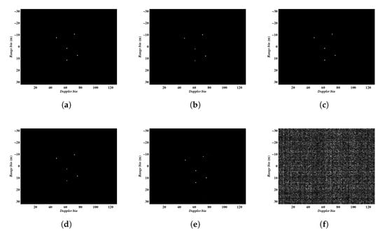 The target main body embraces five scatterers, and besides those, it has two rotating scatterers. The translational motion is assumed to be compensated completely, and only the rotational motion of the main body with a rate of 0.02 rad/s is preserved. The two rotating scatterers rotate around the origin with a radius of 6 and 4 m, and with rotating frequencies of 10 and 5 Hz, respectively. It is assumed that the radar system uses X-band, and the center frequency, bandwidth, PRF, and pulse width are 20 GHz, 0.3 GHz, 100 Hz, and 100 , respectively. The full data are composed of 128 azimuth samples, and each of them contains 128 fast time samples. Figure 4a shows the scatterer model of the target, Figure 4b shows the high-resolution range profile (HRRP) sequence of the full data after pulse compression, and Figure 4c gives the imaging result of RDA with the full data which were used as a reference for performance comparisons. Besides, to quantitatively evaluate the performance of the proposed algorithms, the entropy of the recovered image p, which is defined as , is adopted.