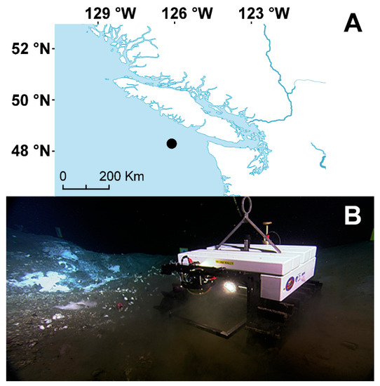 Internet operated deep-sea crawlers represent a novel type of mobile platforms, connectable to cabled observatories, that extend the spatial coverage around the fixed node installations on the ocean floor; hence, expanding the ecological representational power of all acquired data [22,23,24]. They provide high-frequency, multi-sensor oceanographic readings, during very long-term deployments (from months to years), with a remote 24/7 communication capability. Here, expanding on the work published in [25], we present the environmental datasets obtained between late 2009 and late 2016 by the instruments mounted on the crawler “Wally”, deployed at the Barkley Canyon methane hydrates site (NE Pacific, BC, Canada; ~870 m depth, Figure 1) and connected to the Ocean Networks Canada NEPTUNE cabled observatory network (ONC; www.oceannetworks.ca), along with technical difficulties in data acquisition, quality control, and processing. All raw data are archived in near real-time, and can be accessed online on the Ocean Networks Canada database through the “Oceans 2.0” interface (https://data.oceannetworks.ca/DataSearch).