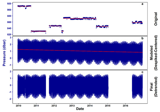 The original hourly pressure observations had a coefficient of V2 ranging from 4.14 × 10−5 to 3.03 × 10−3 (“very small” as per [31]). The original time series, containing deployment periods with differential scales as well as noise, are presented in Figure 2a.