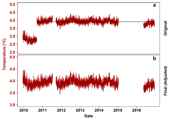 V2 for hourly temperature observations ranged from 0 to 5.35 × 10−2 (“very small”). The temperature means between two successive deployments (i.e., switch in September 2010) differed by 1.16 °C (Figure 3a). Figure 3b presents the final, adjusted temperature time series, after the unrealistically low pre-September 2010 data were moved up so that the aforementioned difference was reduced to ~0.07 °C (i.e., the corresponding temperature difference between the same temporal windows in an adjacent site), with a total of 15,053 values missing (24.54%). The linear relationship between data from hydrates site and the nearby Mid-Canyon East site varied in time (Figure A2; Appendix A.2. Hydrates – Mid-Canyon East Temperature Comparison), leading to the exclusion of using Mid-Canyon East temperatures to back-calculate the bad, pre-September 2010 data.