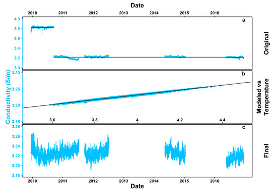 Steps of conductivity data processing. (a) original 7-year time series (i.e., December 2009–December 2016), with black lines indicating the mean in each temporal window, (b) linear relationship between conductivity and temperature and finally, (c) model-predicted time series.