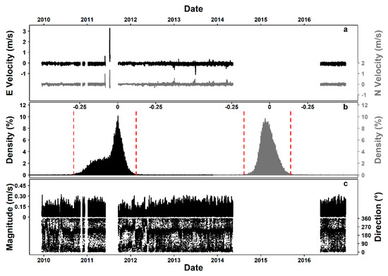 Steps of flow data processing. (a) Original 7-year time series (i.e., December 2009–December 2016) of E (East) and N (North) flow components (i.e., black for E and gray for N), (b) histograms for each component for the despiking of the Aquadopp data and finally, (c) complete time series of flow magnitude and direction.
