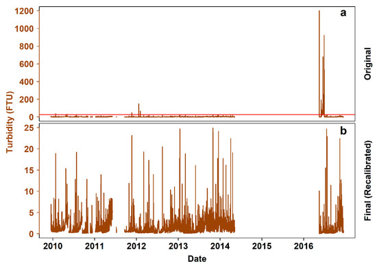Steps of turbidity data processing. (a) Original 7-year time series (i.e., December 2009–December 2016), with the red line indicating the sensor’s theoretical maximum reading (i.e., 25 Formazin Turbidity Units (FTU), based on the selected sensitivity and range settings applied before deployment), (b) clean time series, after back-calculating the sensor’s electrical output and applying the correct calibration coefficients.