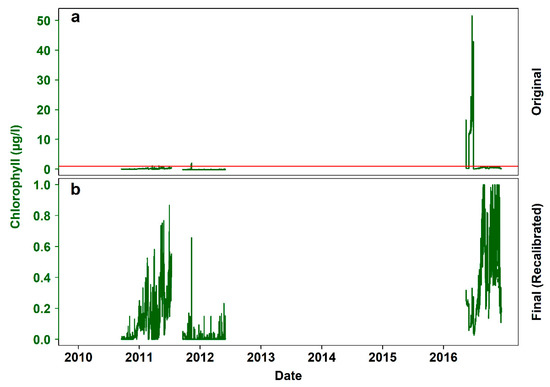 Steps of chlorophyll data processing. (a) Original 7-year time series (i.e., December 2009 – December 2016), with the red line indicating the sensor’s theoretical maximum reading (i.e., 1 μg/L, based on the selected sensitivity and range settings applied before deployment), (b) processed time series, after back-calculating the sensor’s electrical output and applying the correct calibration coefficients.