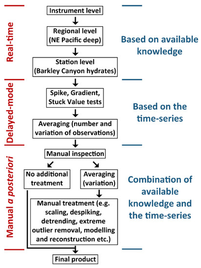 The increasing volume of incoming data needed in order to achieve the principal goals in marine environmental monitoring and management, as they were recently identified in reports by intergovernmental entities (e.g., the Intergovernmental Science-Policy Platform on Biodiversity and Ecosystem Services, IPBES and the Intergovernmental Panel on Climate Change, ICCP [47,48]), demands more automation and standardization in data quality control and treatment. In Figure 8, a schematic description of the hybrid, semi-automated approach followed in this study is provided, based on the adherence of Ocean Networks Canada to the QARTOD guidelines for data management. Manual evaluation and treatment complemented or substituted the automated (real-time and delayed-mode) QAQC steps described in Section 2.2. “Data Collection, Quality Control and Treatment” because automated quality control was incomplete or not performed (quality flag 0) but regular manual inspection by a data expert is recommended for final validation, irrespectively. Real-time, automated tests are based on previous knowledge and can be applied to any individual value without a need for either its adjacent values or the corresponding subset of the time series. On the other hand, delayed-mode automated tests consist of sliding window techniques without taking into account the context of the actual values, and are therefore based entirely on the statistical behavior of the time series. For the manual a posteriori treatment, which was the focus of this study, a combination of both approaches had to be taken into account in order to tackle any underlying issues with the time series.