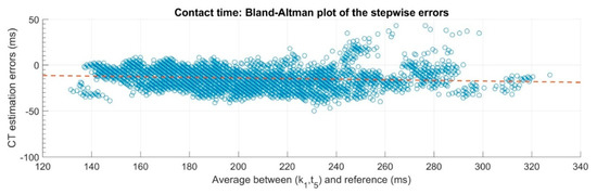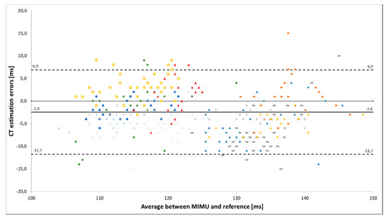 Bland–Altman plot of the estimation errors for the contact time (CT) measured by a MIMU compared to a reference system. Individual athletes are marked in different colors (modified according to Schmidt et al. [14]).