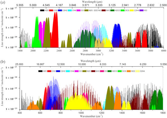 Mid-infrared (MIR) absorption spectroscopy for major atmospheric species in the wavelength range of (a) 2.5–5.555 μm and (b) 5.556–25 μm [102,103].