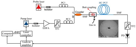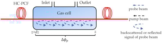 Photothermal spectroscopy in optical fibers has been demonstrated by probing the phase change induced by the gas absorption via fiber-optic interferometry [39,89]. In a typically used pump-probe configuration, the intensity-modulated pump beam and the probe beam propagate in a gas-filled HC-PCF, as shown in Figure 3. When the standard wavelength of the pump beam is tuned to the gas-absorbed wavelength, the pump beam will be absorbed and the gas will be heated, which will modulate the local temperature, density, and pressure in the fiber. Thus, the effective refractive index, and transverse and longitudinal dimensions will change. Then, the accumulated phase of the fundamental mode of the probe beam will be modulated [89].