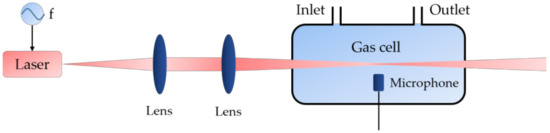 Photoacoustic spectroscopy is an absorption-based technique with its relative simplicity, ruggedness, and overall sensitivity, which plays a key role in trace gas detection [40,41,42]. Figure 4 illustrates the basic sensing principle of the photoacoustic spectroscopy. The laser with periodically modulated intensity or wavelength propagates to the gas cell, where the laser is absorbed by gas molecules and converted to local heating via collisions and de-excitation. Then, the acoustic waves will generate and can be detected by a microphone, and the gas concentrations can be restored by data processing [28].