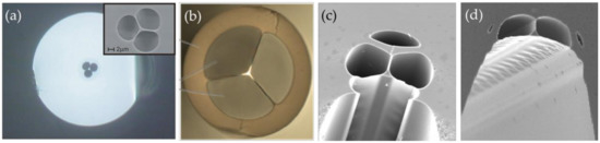 (a,b) Cross-section images of suspended core photonic crystal fibers (SC-PCFs) with triangular-like microcores [53,58]. (c,d) Cross-section images of exposed-core SC-PCFs fabricated by etching the drawn fiber and drawing from the drawing tower [112]; the image sizes are 40 µm.