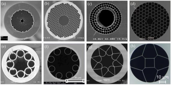 Scanning electronic microscopy (SEM) images of some representative hollow-core photonic crystal fibers (HC-PCFs): (a) Commercial available hollow core photonic bandgap fiber (HC-PBGF): HC-1550-02 from NKT Photonics [138]; (b) HC-PCF designed for the guiding in the MIR region [137]; (c) Hollow core Bragg fiber [74]; (d) Kagome lattice HC-PCF [124]; (e) hollow core antiresonant fibers (HC-ARF) [59]; (f) nodeless HC-ARF [78]; (g) hollow fiber with negative curvature of the core wall [73]; (h) double anti-resonant hollow square core fiber [72].