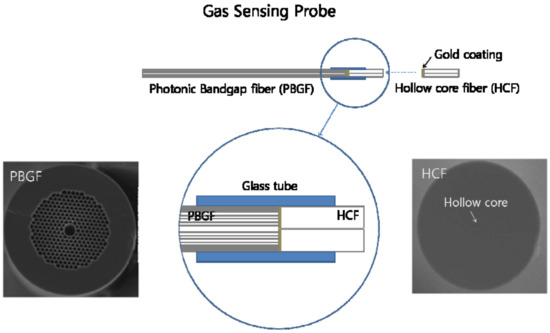 - A wide transmission wavelength band can be chosen from the deep ultraviolet (UV) to the MIR region [72,73,74] through the flexible structure design of HC-PCFs. Especially, the MIR region is very suitable for gas sensing based on the gas absorption that was mentioned in Section 2.