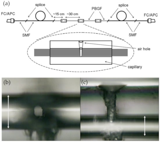 (a) Fiber assembly for the gas sensor. FC/APC: ferrule connector/asperity polishing connector. (b,c) Images of the laser drilled hole in a glass capillary tube side, from a vertical and a front view respectively [85].