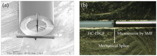 (a) SEM image of a penetrated hole of 5 × 5 μm2 in an HC-PBGF. (b) Image of the mechanical connection between the PCF and the SMF with a micromirror [88].