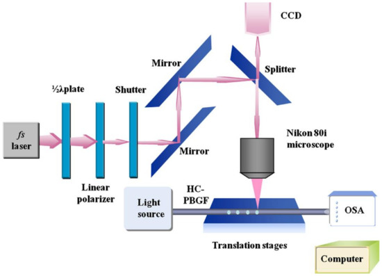The femtosecond (fs) laser system for fabricating microchannels in an HC-PBGF [42].