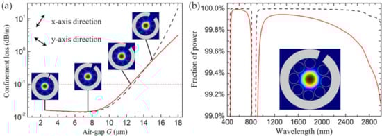 - Hao, Y.; Xiao, L.; Benabid, F. Optimized design of unsymmetrical gap nodeless hollow core fibers for optofluidic applications. J. Lightwave Technol. 2018, 36, 3162–3168. [Google Scholar] [CrossRef]