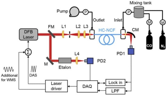 Gas sensing has a significant impact on a wide range of applications in petrochemical industries [1], atmospheric science [2,3], clinical diagnosis and monitoring [4], etc. Gas detection can be implemented by many different approaches such as chromatographs [4], catalyst-based devices [5], semiconductors [6], and electrochemistry [7]. However, the performance may be limited by the cross responses of different gases or the noises in the amplifier circuit [5,6,7]. Currently, wavelength modulation spectroscopy (WMS) [8,9] and active intra-cavity methods [10,11] have been utilized to increase the detection sensitivity. However, the applications based on these methods are still hindered by their large system volumes, time-consuming operation, strict working environments, and complicated detection principles [12,13].