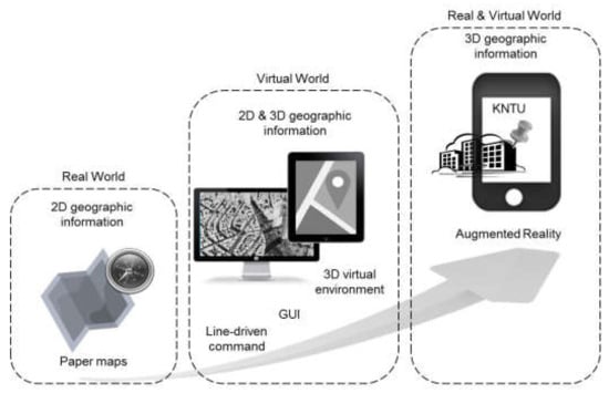 Over time, geospatial information has evolved from paper maps to desktop GIS, then to web-based GISs, and finally arriving at the current stage of mobile GISs and ubiquitous GIS [16]. The user experience of paper maps occurs completely in the physical world and is restricted to visualizing geospatial/geographic information. With the advent of computers, geospatial information is represented in a virtual space where many difficult and impossible operations in the real world become possible [17]. The first generation of line-driven command GIS user interfaces through which users interact with the computer program with successive lines of text has been replaced with graphic user interfaces (GUIs) and then with 3D virtual environments (VEs) with virtual walking and a bird’s-eye view [3].