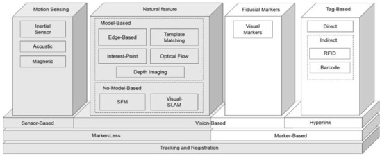 Vision-based techniques are accurate and reliable, although they are more complicated in comparison to sensor-based approaches [102]. ARKit (https://developer.apple.com/arkit/), ARCore (https://developers.google.com/ar/), and Vuforia (https://www.vuforia.com/) are important AR libraries in vision-based technologies. Vision-based techniques are discussed in the following.
