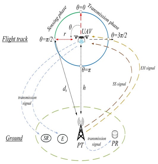 The system model consists of an energy-constrained UAV (e.g., surveillance drone) as a secondary (cognitive) transmitter, a corresponding secondary receiver (SR), a ground-mounted primary transmitter (PT) and receiver (PR) pair, and an eavesdropper (E), as shown in Figure 1. An energy harvesting UAV (EH-UAV) flies in a circular fight track with a constant velocity (speed) v with PT locating at the center. The altitude of EH-UAV relative to the PT is h, and the radius of circular track is given by r. The on-board power supply is responsible for the energy required for the flight operations, i.e., hovering and transition, with recharging possible only after the completion of each flight. The EH-UAV opportunistically exploits the primary-band, i.e., owned by PT and PR, in the absence or presence of E. The PT and PR communicate probabilistically during the flight of EH-UAV, which is divided into the sensing and transmission radians, i.e., sensing and transmission periods. In the sensing phase with a duration of t, the EH-UAV simultaneously harvests RF energy from the received signal and performs the spectrum sensing (SS) procedure for the opportunistic use of the primary band. The dynamic power splitting device splits the received primary signal into the two power fractions of and for EH and SS purposes, respectively, where denotes the power splitting factor [15]. In the transmission phase with a duration of , the EH-UAV performs the full-proportioned EH, i.e., , if a signal from PT is detected. Otherwise, the EH-UAV sends its data to SR with the portion of powers gathered in the sensing phase through EH unit, and on-board supply. We consider the linear EH model, i.e., the harvested power is linearly proportional to the received RF power [16,17]. During the circular flight, the EH-UAV consumes energy in SS and EH procedures during the sensing phase, and in EH or information-transmission procedures during the transmission phase, respectively. In cellular systems, the sector antennas are generally used for the ground-stations, with projection of the radiation pattern determines the coverage area. Moreover, a down-tilt setting strategy is considered when the base station is located in higher altitude than the user equipment [18]. In proposed scenario, the ground-mounted PT is assumed to be equipped with the omnidirectional antenna. The reason is that only the received signal-to-noise ratio (SNR) at the UAV, irrespective of the signal characteristic, is considered. For example, a base station with three sectors transmits the three different signals via the three sector antennas. However, in terms of the signal energy (not the individual signal), it can be regarded as the omnidirectional pattern. The sector antennas for a PT, i.e., a base station, with a down-tilt setting strategy can also be considered. However, the received sensing SNR at the UAV will be lowered for such a scenario. Moreover, because the primary signal is considered only for the energy detection, the detail model for the primary signal is not required. The signal transmission from PT across the channel is modeled by the two-state Markov chain model, with random variables representing the duration of each state following the exponential distribution. Moreover, and are the stationary probabilities for the and states, respectively [19,20]. An state indicates that the channel is being used by the PT (unavailable for the EH-UAV), while the state indicates that the channel is free and there is no activity of PT.