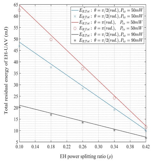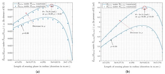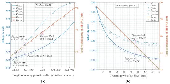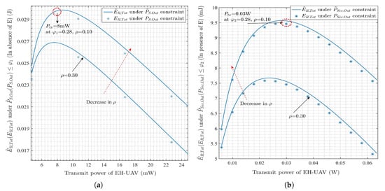 Finally, Figure 7a,b show the numerically obtained joint optimal solution pairs to the optimization problems in Equations (29) and (36), i.e., (, ) and (, ), respectively. It can be observed that the and , which validates the fact that the EH-UAV must increase its to meet in the presence of E. This, in turn, reduces the required length of transmit phase () for EH-UAV, and consequently the value of also increases. Thus, the requirements for the optimal and also increase. Our results identify the requirements of and for the maximization of residual energy while maintaining reliable and secure communications (in the presence and absence of E, respectively), and provide the guidelines in designing an energy-harvesting UAV-based CR system.